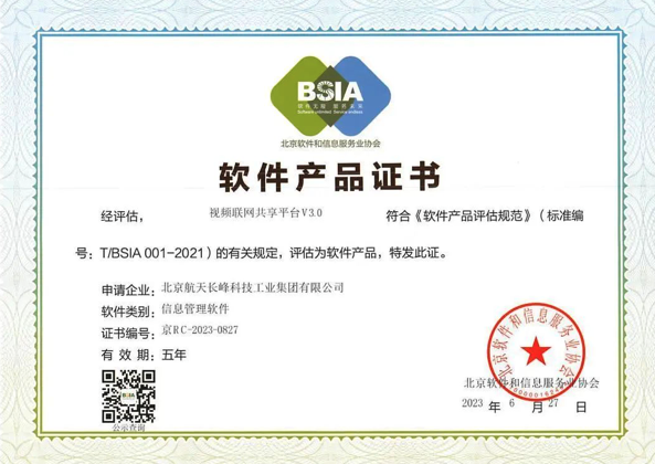 近日,经北京软件和信息服务业协会评估,航天长峰所属长峰科技符合《软件企业评估标准》(T/SA002-2019),顺利通过2023年《软件企业》双软资质复评。中国软件行业协会和北京软件和信息服务业协会分别颁发“软件企业”资质证书,公司“视频联网共享平台V3.0”被评估为软件产品。